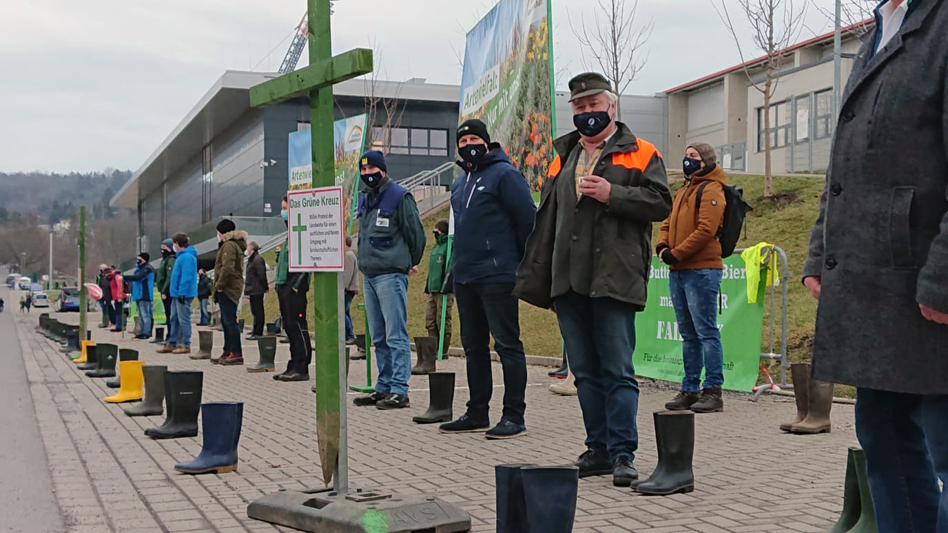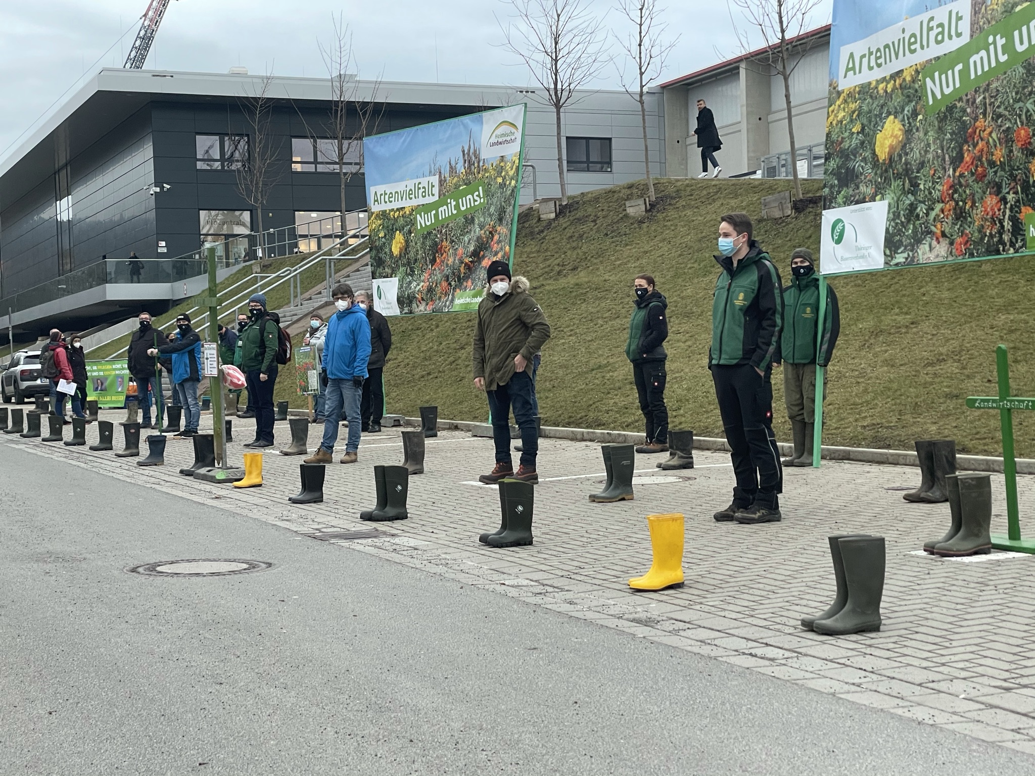 Am Freitag, den 5. Februar, protestierten Thüringer Landwirt*innen und Vertreter*innen des Thüringer Bauernverbandes (TBV) vor der Plenarsitzung des Thüringer Landtags am Steigerwaldstadionin Erfurt für den Stopp des Insektenschutzgesetzes und der Pflanzenschutz-Anwendungsverordnung in den vorliegenden Fassungen. Die Gesetzesinitiativen führen zur Existenzgefährdung für eine Vielzahl landwirtschaftlicher Betriebe. Das drohende Höfesterben in Thüringen setzten die Landwirt*innen mit einer Kombination leerer Gummistiefel und Grüner Kreuze symbolisch vor dem Stadion in Szene.
