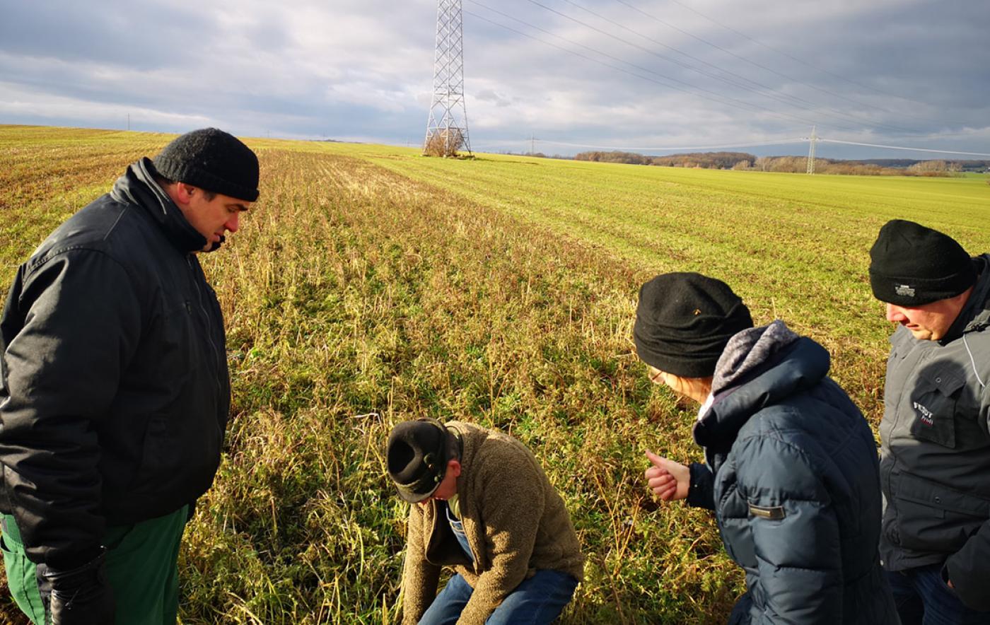 Die Gewässerschutzkooperation Teilprojekt Erosion (U.A.S. Umwelt- und Agrarstudien GmbH) traf sich am 8. Dezember beim Kooperationsbetrieb Weirich in Zottelstedt zum Thema „Strategien für den Zwischenfruchtanbau und Maßnahmen für den Erosionsschutz“. Nach wie vor stellt sich der Zwischenfruchtanbau komplexer dar, als gedacht: Läuft die gewählte Saatgutmischung verlässlich auf, wird das Ausfallgetreide ausreichend unterdrückt. Der rege Austausch direkt am Feld brachte für die teilnehmenden Betriebe nützliche Praxistipps, u.a. von Frau Dr. Knoblauch aus dem Thüringer Landesamt für Landwirtschaft und Ländlichen Raum. Demnach sollte die Zwischenfruchtaussaat in den Trockengebieten direkt nach dem Drusch erfolgen (Unterdrückung des Ausfallgetreides) und der Zwischenfruchtbestand sollte nicht zu massig werden, damit das Wasserdangebot für die Folgekultur ausreichend ist. Des Weiteren stellte Knoblauch heraus, dass die Komponente Rauhafer in der Mischung zu überdenken ist, da sich u.a. die alleopathische Wirkung besonders auf die Folgekultur Sommergerste auswirkt. Schlussendlich trägt eine gelungene Zwischenfrucht dem Erosionsschutz maßgeblich bei.