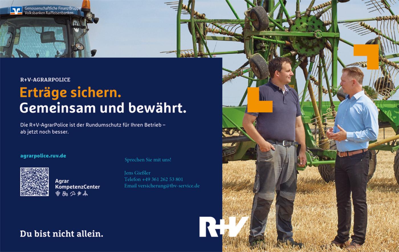 Kontaktieren Sie hierzu Ihren Berater Jens Gießler per E-Mail unter versicherung@tbv-service.de oder telefonisch unter +49 (0)361 262 538 01. Weitere Informationen zur R+V-AgrarPolice und der Gebäude/Inhalt-Bausteine erhalten Sie auf www.ruv.de unter „AgrarPolice“.