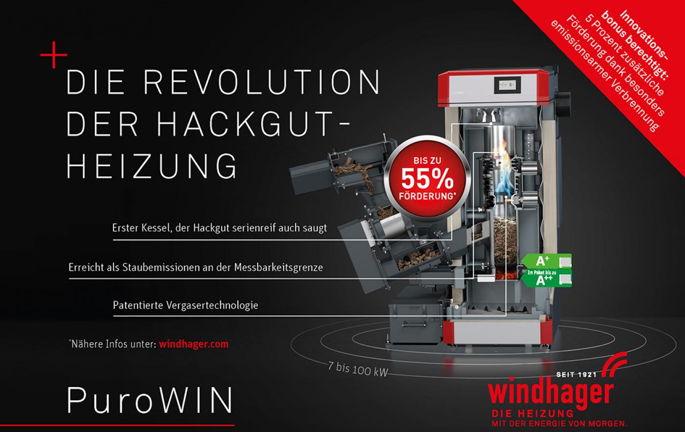 Für die Entwicklung dieser innovativen Hackgutheizung wurde Windhager bereits mehrfach ausgezeichnet, u.a. mit einem Energy Globe und dem Eco-Design Preis des deutschen Umweltministeriums. Auch die zahlreichen zufriedenen Kundinnen und Kunden bestätigen, wie einfach, sauber und zuverlässig das Hackgutheizen mit dem neuen PuroWIN funktioniert. Wer sich ein Bild davon machen möchte, findet auf der Windhager Webseite zahlreiche Referenzen sowie weitere Informationen. Der PuroWIN ist in insgesamt 9 Leistungsgrößen von 7 bis 103 kW verfügbar.