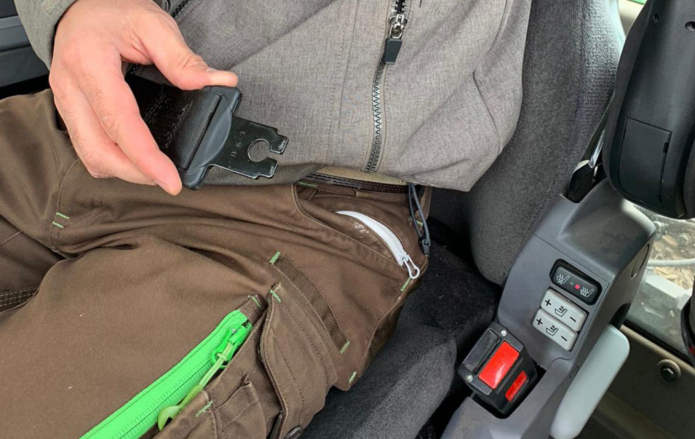 Obwohl der Beckengurt mittlerweile in Traktoren zur Standardausrüstung gehört, wird er oft nicht genutzt. „Gurt-Muffel“ gefährden dadurch Leib und Leben. Stürzt das Fahrzeug um, kann die bzw. der nicht angeschnallte Fahrerin bzw. Fahrer aus der Kabine geschleudert werden – mit fatalen Folgen.