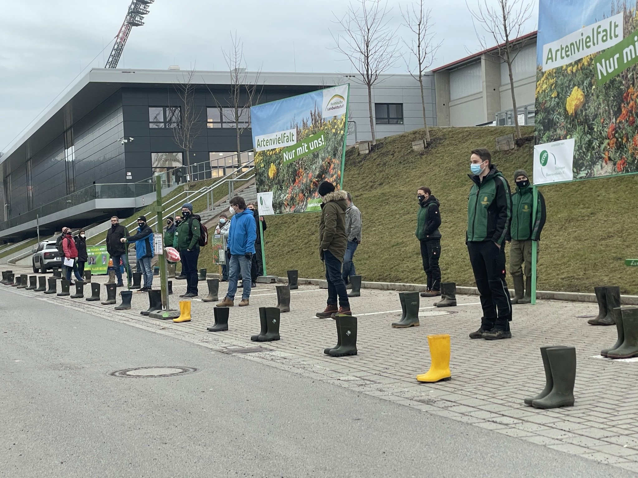 Am Freitag, den 5. Februar, protestierten Thüringer Landwirt*innen und Vertreter*innen des Thüringer Bauernverbandes (TBV) vor der Plenarsitzung des Thüringer Landtags am Steigerwaldstadionin Erfurt für den Stopp des Insektenschutzgesetzes und der Pflanzenschutz-Anwendungsverordnung in den vorliegenden Fassungen. Die Gesetzesinitiativen führen zur Existenzgefährdung für eine Vielzahl landwirtschaftlicher Betriebe. Das drohende Höfesterben in Thüringen setzten die Landwirt*innen mit einer Kombination leerer Gummistiefel und Grüner Kreuze symbolisch vor dem Stadion in Szene.