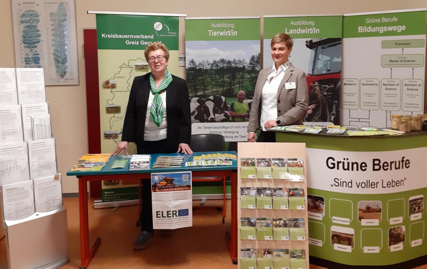 Auch der Kreisbauernverband Greiz/Gera sowie Saale-Orla-Kreis waren vor Ort und warben um Nachwuchs für die Landwirtschaftsbranche. Hierfür wurde viele interessante Gespräche geführt und viele Fragen zu den Anforderungen und Möglichkeiten einer Ausbildung in den Grünen Berufen gestellt. Die Kreisbauernverbände präsentierten interessierten Schülerinnen und Schülern ab der siebten Klasse bis hin zu der Oberstufe sowie Quereinsteigern und Personen mit Umschulungen die unterschiedlichen Ausbildungs- und Berufsmöglichkeiten, sodass diese eine konkrete Vorstellung darüber gewinnen konnten. Aufgrund des regen Interesses der Schülerinnen und Schüler sowie der der angehenden Absolventinnen und Absolventen für eine Ausbildung bzw. Studium oder Tätigkeit in der Landwirtschaft, sollte der eine bzw. die eine oder andere seinen bzw. ihren Weg in die Grüne Branche finden.