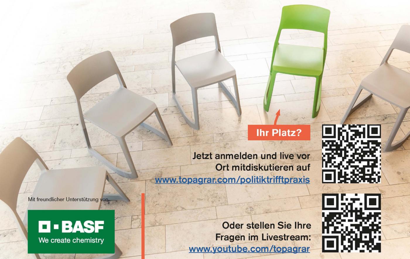 Wer Interesse hat, selber in die Diskussion einzusteigen, kann sich ab sofort bei "Politik trifft Praxis" anmelden. Weitere Informationen sowie der Weg zur Anmeldeseite ist unter https://www.topagrar.com/acker/news/politik-trifft-praxis-neues-talk-format-von-top-agrar-13307875.html zu finden (Einladung "Politik trifft Praxis" als PDF).