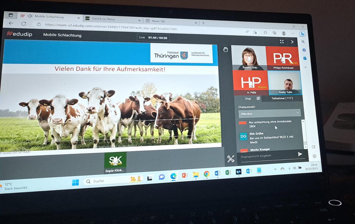 Am 30. März fand die Onlineveranstaltung zur "Mobilen Schlachtung in Thüringen" statt. Die 120 Teilnehmenden zeigten großes Interesse an der Veranstaltung. Nicht nur Thüringerinnen und Thüringer, auch Interessierte aus unseren Nachbarbundesländern nahmen am Seminar teil.