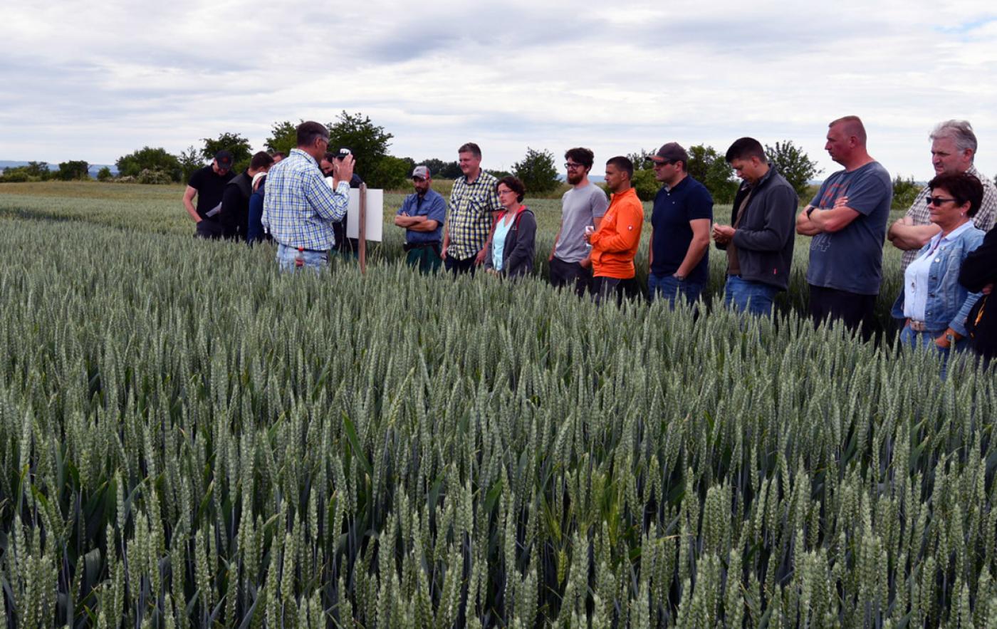 Die zumeist jüngeren Anwesenden bekamen am Feld die Möglichkeit, die Ährenentwicklung, die Blattfläche, die Dichte des Bestandes sowie die Gesundheit der Pflanzen genau in Augenschein zu nehmen, wie sie unter den diesjährigen Bedingungen gegeben sind. Neben den Ertragsindikatoren spielte vor allem die Frage der Trockenresistenz eine entscheidende Rolle in den Diskussionen mit den Vertretern der Saatgutproduzenten. Der Schutz vor Boden- oder Pflanzenaustrocknung wird nicht zuletzt durch die in diesem Jahr erneut aufkommende Trockenheit zukünftig noch mehr Bedeutung in der Züchtung bekommen. Ein Königsweg existiere bisher nicht, aber es gebe mehrere Sorten, die mit trockenen Bedingungen besser umgehen können. Temperaturen von über 30 Grad sind für die Pflanzen aber auch weiterhin eine Gefahr.
