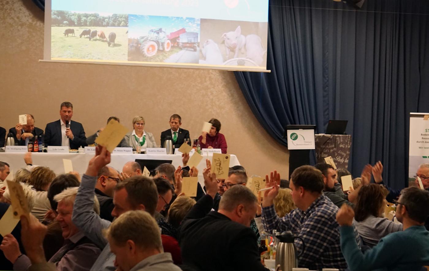 Am 30. November fand die diesjährige Landesvertretersammlung und der Jahresabschluss des Thüringer Bauernverbandes statt (TBV). Rund 200 Delegierte trotzen dem Schnee und kamen im Bürgerhaus in Apfelstädt zusammen, um zu erfahren, wie sich die Verbandsarbeit in den letzten 12 Monaten darstellte. TBV-Präsident Dr. Klaus Wagner sprach in seinem Bericht die politischen Themen auf Landes- und Bundesebene an, die im Berichtszeitraum auf der Agenda des Verbandes gestanden hatten. Darunter waren u.a. die neue GAP, das in Thüringer aufgelegte Agrarstrukturgesetz, die Pflanzenschutzmittelreduktionsstrategie (SUR) der Europäischen Union sowie die gestiegenen Tierkörperbeseitigungskosten im Freistaat. Harsche Kritik äußerte er an dem Versuch der Thüringer Agrarverwaltung, die Antragsstellung in diesem Jahr zu digitalisieren. Die dafür bereitgestellten Hilfsmittel, das Antragsportal PORTIA und die FAN-App, waren technisch nicht ausgereift, sodass die Antragsstellung für viele Landwirtinnen und Landwirte nur schwer und mit sehr hohem Aufwand zu realisieren war. Hauptgeschäftsführerin Katrin Hucke und ihr Stellvertreter Michael König stellen anschließend den Geschäftsbericht vor, anhand dessen die Arbeit und finanzielle Lage des Verbandes deutlich wurde. Nach dem Bericht der Revisionskommission, der durch Dr. Gerd Schaller vorgestellt wurde und einige Verbesserungsvorschläge für die zukünftige Verbandsarbeit enthielt, wurde der Geschäftsführung Entlastung erteilt. Auch die Änderung der Beitragsordnung wurde mit großer Mehrheit mit einigen vereinzelten Enthaltungen und Gegenstimmen angenommen. Durch diese Entscheidung steigen die Mitgliedsbeiträge für persönliche Mitglieder des TBV leicht auf drei Euro pro Monat, insgesamt 36 Euro pro Jahr,