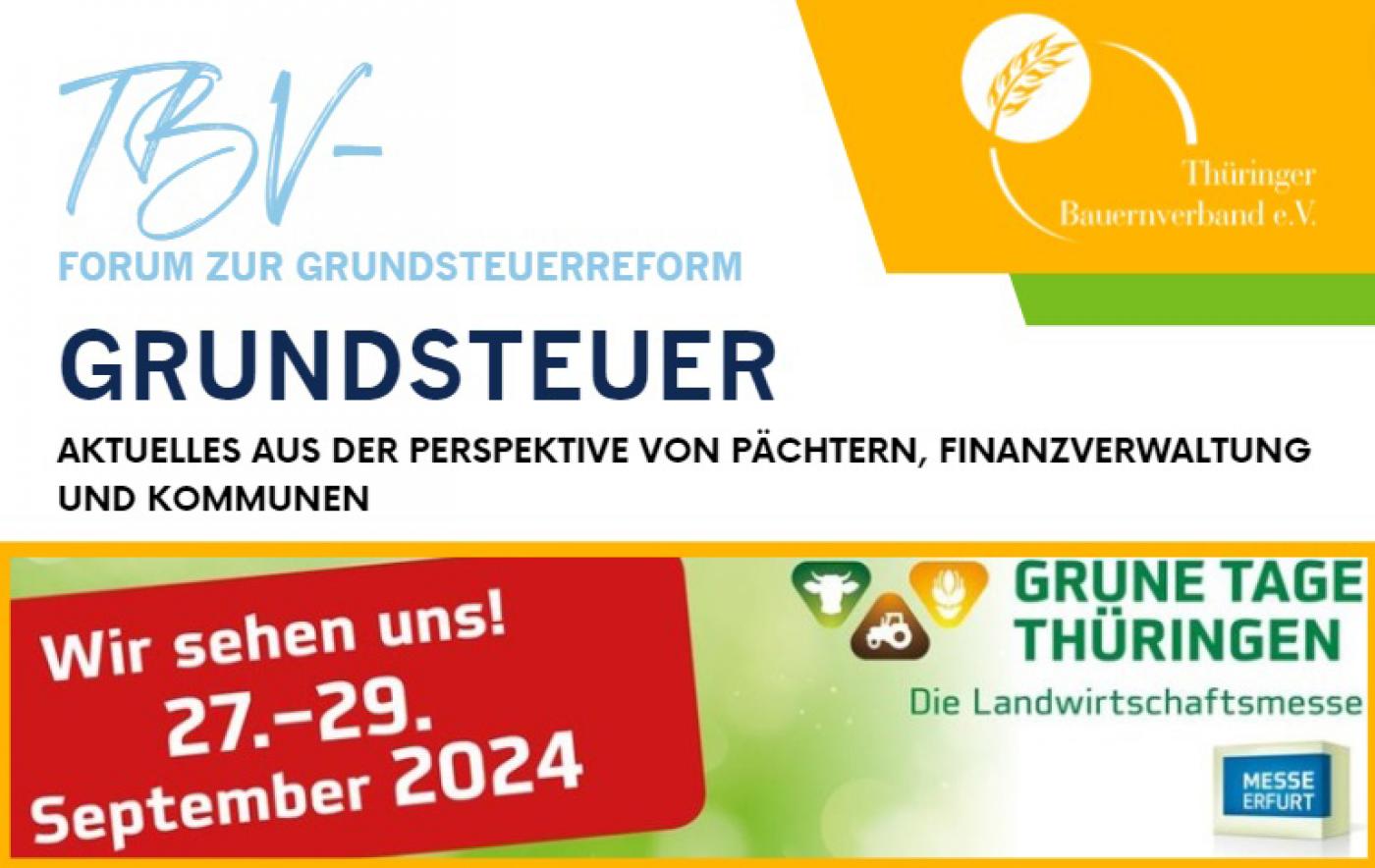 Im Rahmen der Landwirtschaftsmesse Grüne Tage Thüringen veranstaltet der Thüringer Bauernverband (TBV) ein Forum zum Thema „Grundsteuerreform: Aktuelles aus der Perspektive von Pächtern, Finanzverwaltung und Kommunen“. Hierzu laden wir alle Medienvertreter sowie Interessierte herzlich ein, Fragen zu stellen und sich in die Diskussion einzubringen.