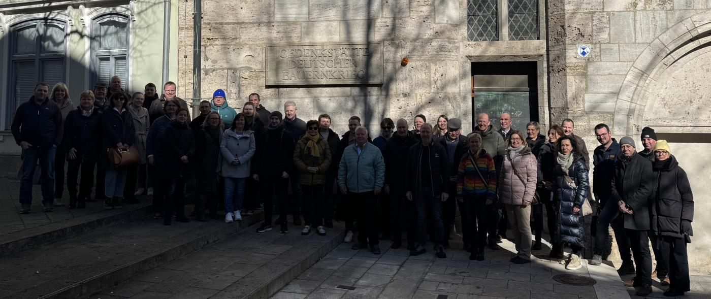 Der zweite Klausurtag widmete sich den Themen: Bauernkrieg und KI in der Landwirtschaft. In einem einstündigen Stadtrundgang wurde den Tagungsteilnehmern der Bauernkrieg von 1525 historisch näher gebracht und im Anschluss die Höhepunkte des Gedenkjahres in den Städten Mühlhausen und Bad Frankenhausen, den „Orten des Geschehens“ der Thüringer Landesausstellung 2025 „freihyt 1525 – 500 Jahre Bauernkrieg“, vorgestellt.