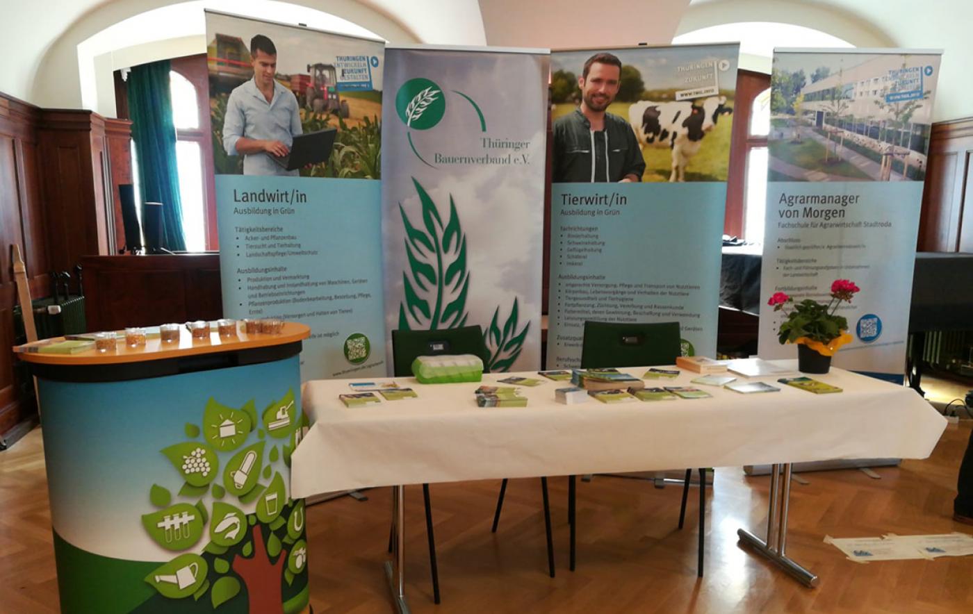 Ausbildungsinhalte in den Grünen Berufen und Kontakte zu Ausbildungsbetrieben in der Region wurden am Gemeinschaftsstand der Zuständigen Stelle für Berufsbildung des Thüringer Landesamtes für Landwirtschaft und Ländlichen Raum und des Bauernverbandes Eisenberg, Jena, Stadtroda präsentiert.