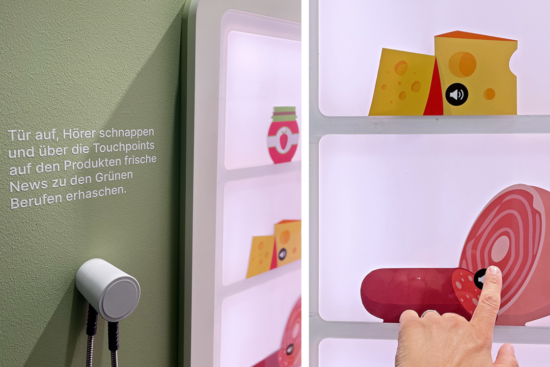Um die junge Zielgruppe für eine „grüne“ Ausbildung zu begeistern, setzt das Ausstellungskonzept auf mediale Inhaltsvermittlung. Mit interaktiven Medienstationen werden die Besucherinnen und Besucher animiert sich spielerisch über die „grünen Berufe“ und deren Ausbildung zu informieren.